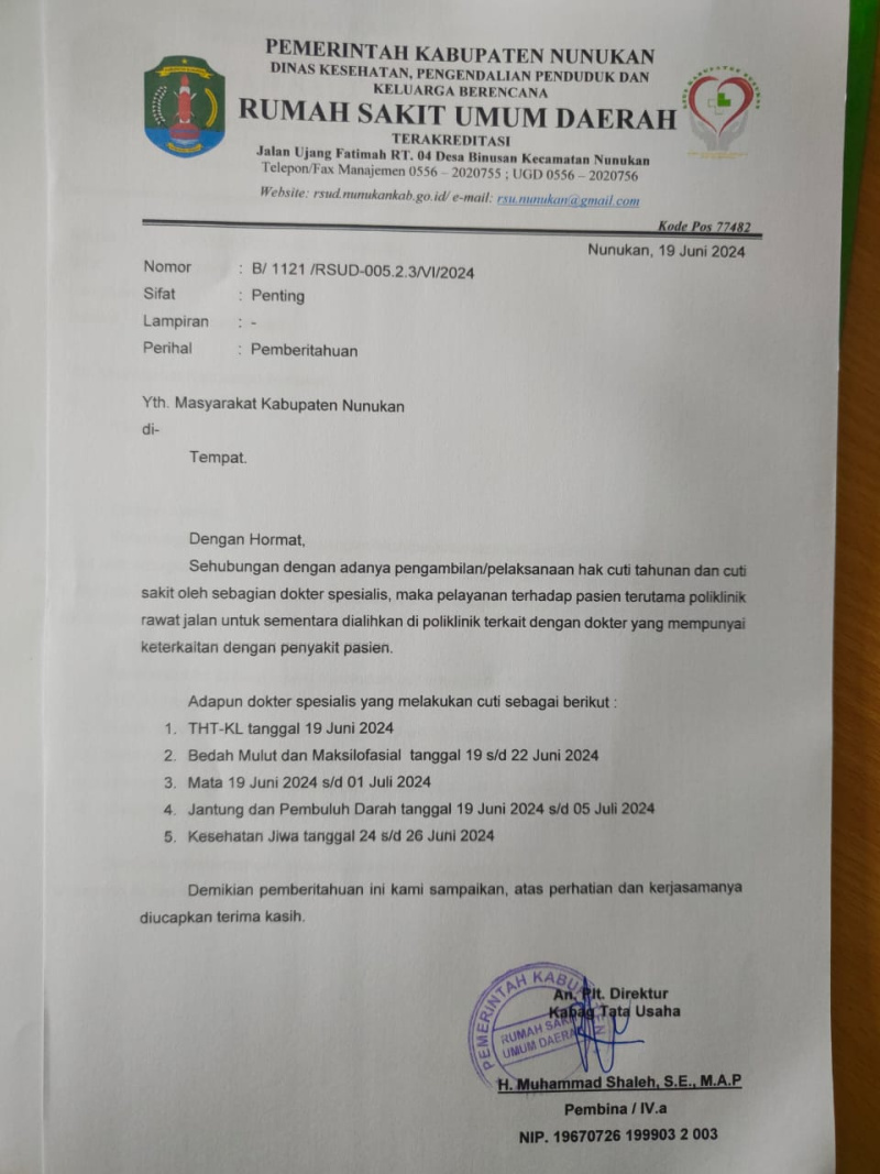 Surat yang beredar itu menggunakan kop surat RSUD Nunukan bernomor B/1121/RSUD-005.2.3/VI/2024 tertanggal 19 Juni 2024 dengan klasifikasi penting. Surat tersebut ditandatangani Kepala Bagian Tata Usaha RSUD Nunukan H Muhammad Saleh atas nama Plt Direktur.