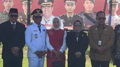 Tokoh masyarakat Pulau Sebatik Haji Herman Baco (Haji Andeng) paling kiri foto bersama usai mengikuti upacara HUT Kemerdekaan RI yang ke-79, Minggu (17/8). FOTO: BT.Com