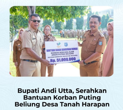 Bantuan yang diserahkan kepada 15 kepala keluarga korban puting beliung ini berasal dari Kementerian Sosial untuk biaya rehabilitasi rumah, total Rp51 juta. Sekadar informasi, puting beliung yang menerjang warga Desa Tanah Harapan ini pada Senin, tanggal 10 Februari 2025, sekitar pukul 15.15 WITA.