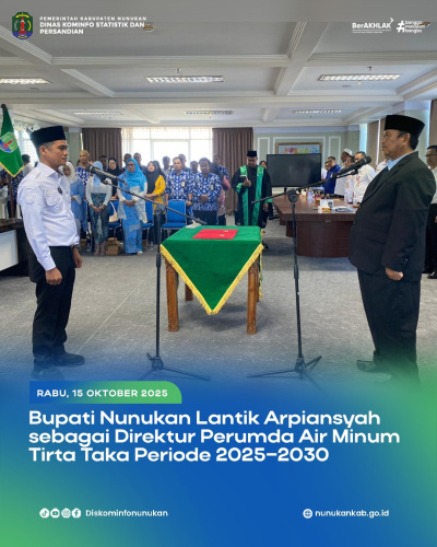 Nunukan (BERANDATIMUR) — Bupati Nunukan H. Irwan Sabri melantik Arpiansyah sebagai Direktur Perusahaan Umum Daerah (Perumda) Air Minum Tirta Taka periode 2025–2030. Pelantikan berlangsung di Ruang Kerja Bupati Nunukan, Lantai III Kantor Bupati Nunukan, Rabu 15 Oktober 2025.